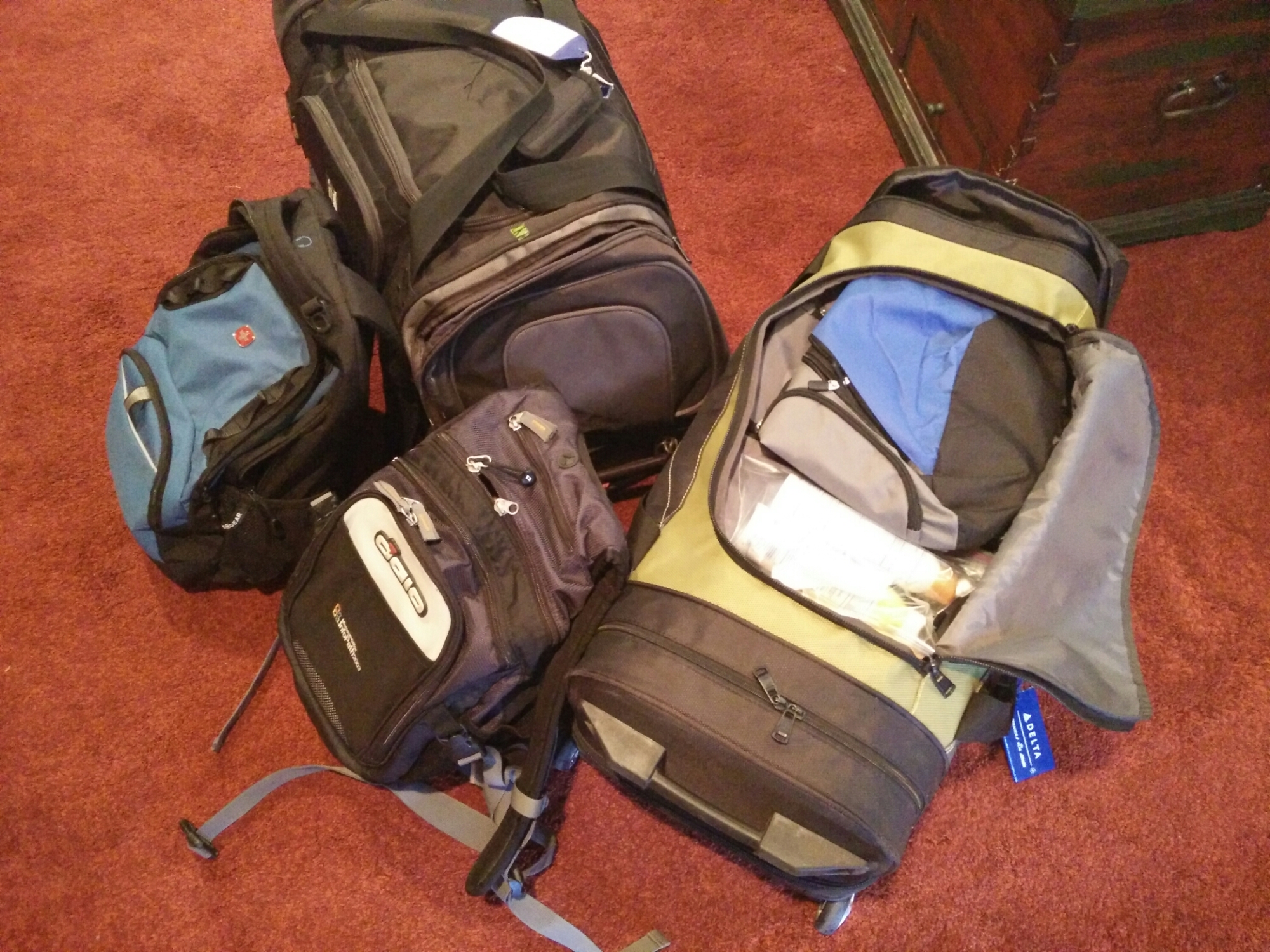 Two huge FUL brand bags (thank you, Costco!) for our “storage.” A backpack each for easy access to two days’ (is apostrophe correct? I never know.) worth of clothes. And, a daypack each for day-to-day hiking/outing use. All filled nearly to the brim.