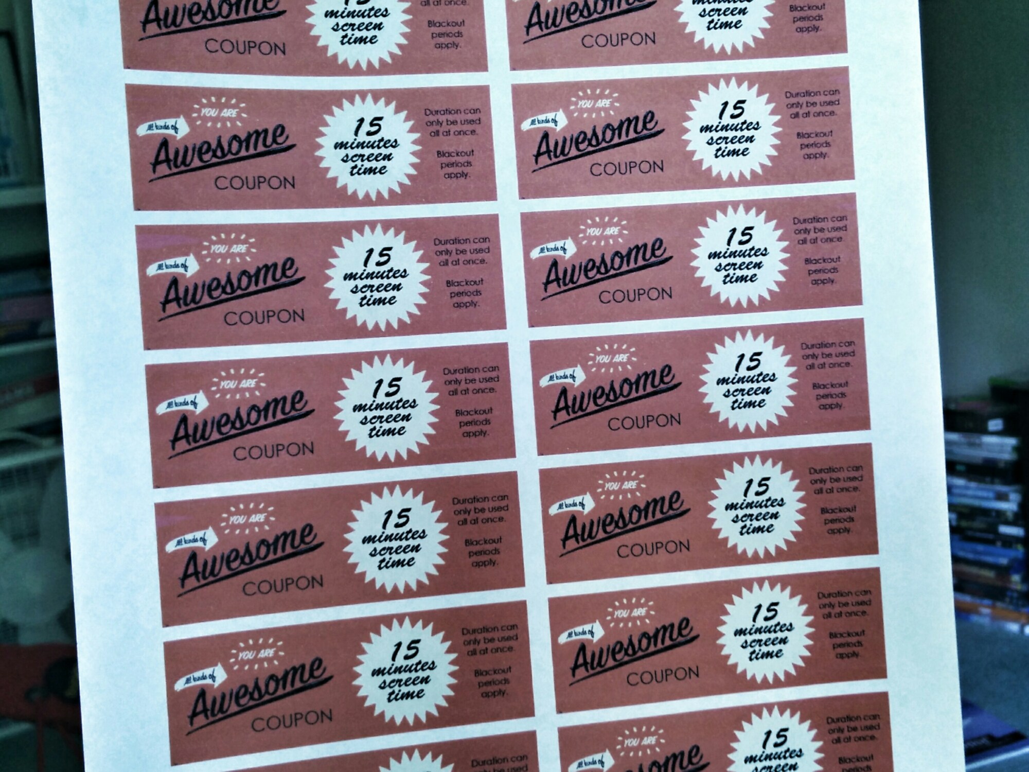 For her second trick, today Carolyn created “You are all kinds of awesome” coupons. The idea behind these is to reward great behavior, while concurrently limiting screen time (e.g. phone, PC, TV).